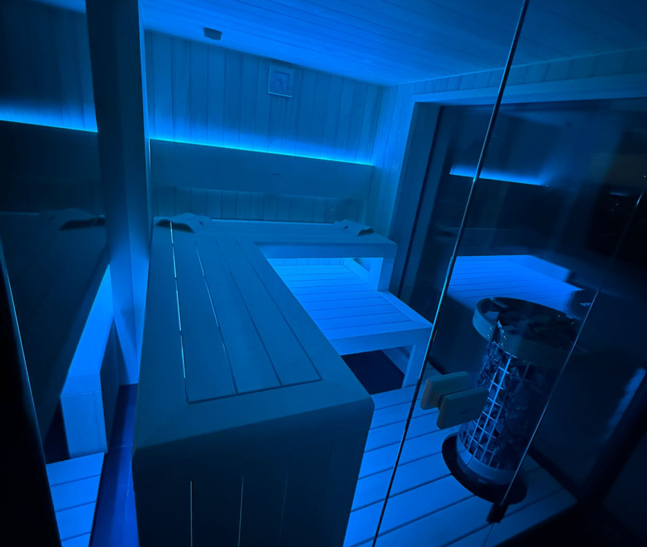 Najvýraznejším prvkom je kompletné presklenie z troch strán. Použité 10mm sklo je uchytené pomocou dizajnových terčov, ktoré nechávajú vyniknúť čistej ploche bez rušivých rámov. Technicky aj vizuálne výnimočným detailom je lepený presklený roh – riešenie, ktoré kladie vysoké nároky na presnosť výroby i montáže. Vďaka nemu pôsobí sauna takmer ako sklenený objekt vložený do interiéru, nie ako uzavretá kabína.