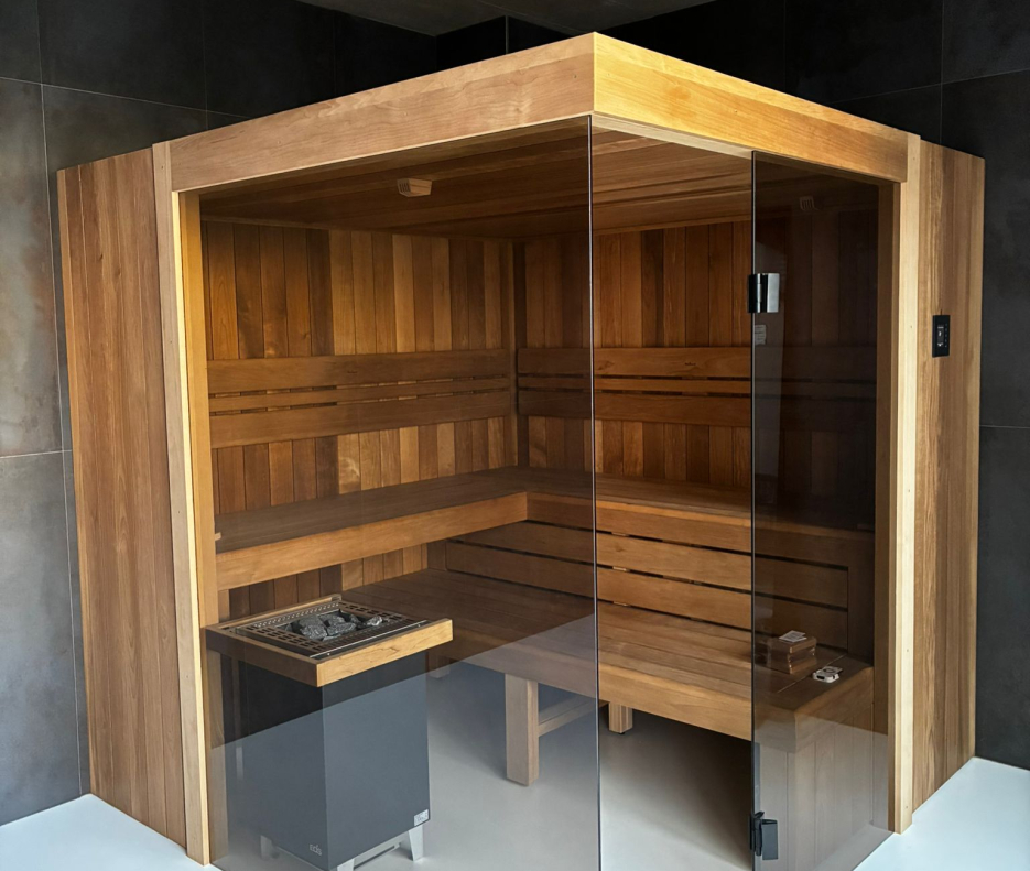 Dominantným prvkom celej realizácie je presklený roh. Ten narúša uzavretosť klasickej sauny a prepája ju s okolitým interiérom. Výsledkom je vzdušnejší dojem a zároveň zaujímavá hra svetla a odrazov, ktorá sa mení podľa dennej doby. Presklenie prináša nielen estetickú hodnotu, ale aj pocit väčšieho priestoru, čo ocení každý, kto má rád otvorenejšie a modernejšie riešenie.