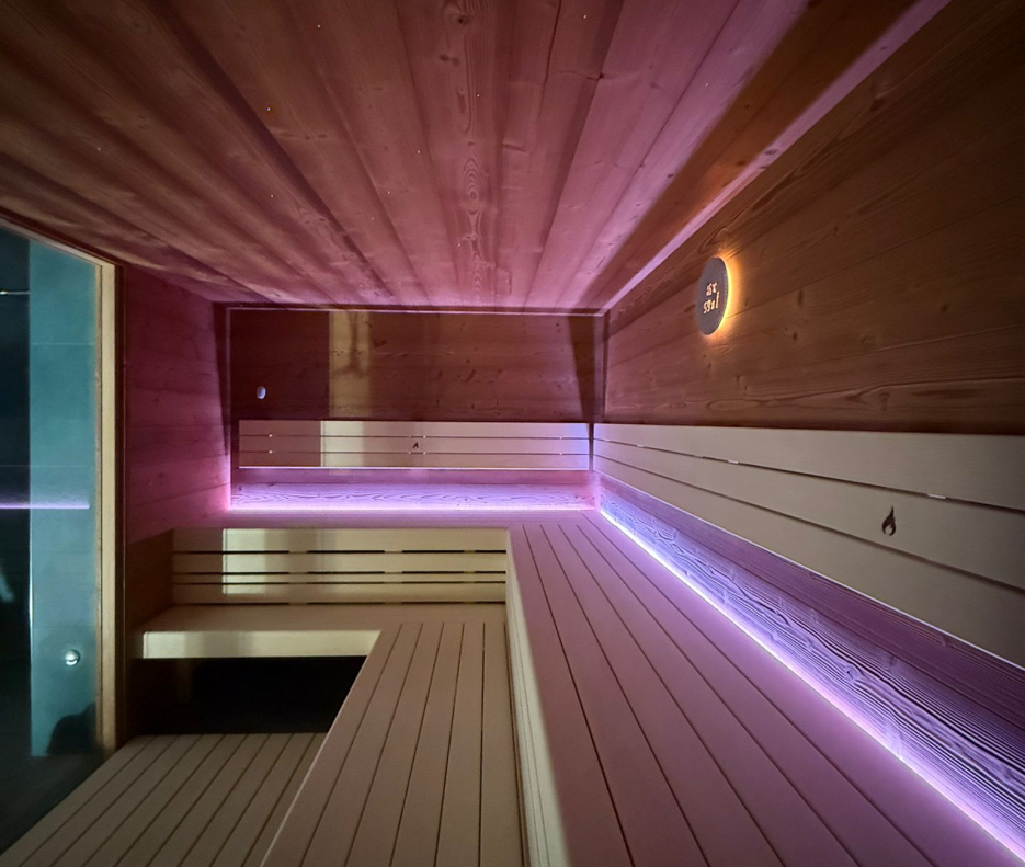 Pre dokonalú atmosféru nechýba RGB podscítenie lavíc, ktoré premenia každý saunový rituál na osobnú scénu pokoja. Hudobný systém DEXON MRP 4170 so štyrmi reproduktormi navyše, umožňuje vychutnať si obľúbenú hudbu či relaxačné zvuky na pozadí. Skutočnú perku. Čelná presklená stena je dotiahnutá obkladom až ku stropu, palubovky sú v bezlištovom prevedení a veľké okno ponúka výhľad priamo do prírody. Čerešničkou na torte sú dvere zdobené dubovými lyžami namiesto madiel, ktoré dopĺňajú horský charakter a dodávajú priestoru jedinečnú osobitosť.